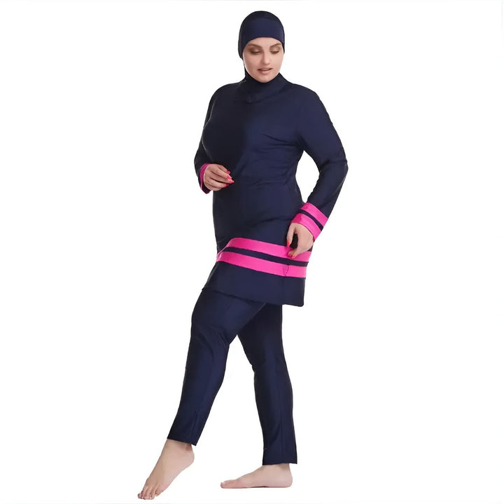- مجموعة بوركيني كاملة مكونة من 3 قطع لملابس السباحة المحتشمة، بما في ذلك قبعة السباحة، وقميص السباحة، والبنطلون.
