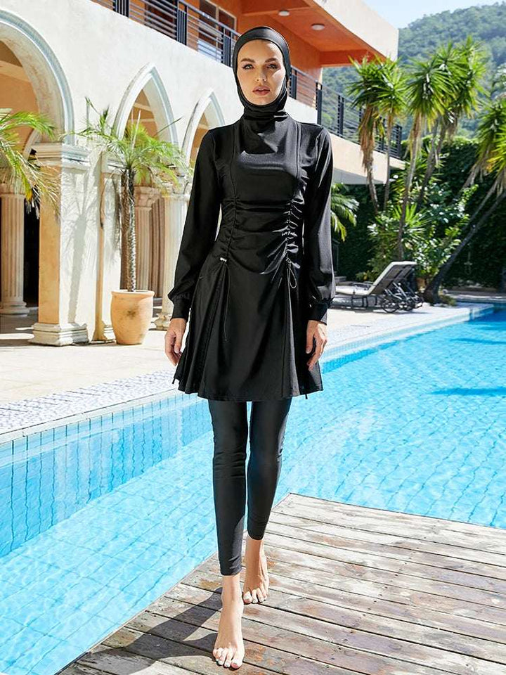 • التغطية: مجموعة مكونة من ثلاث قطع بتغطية كاملة مع بنطلون للاحتشام