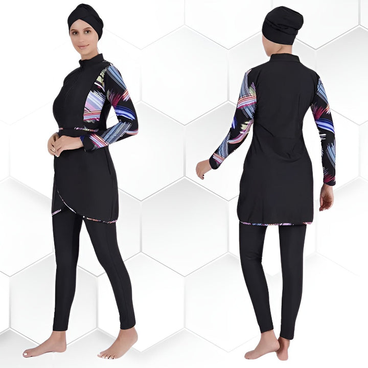 مجموعة كاملة مكونة من 3 قطع: استمتع بالتنوع مع مجموعة شاملة، تتكون من ملابس السباحة، وسروال السباحة، وقبعة السباحة - حل متكامل لاحتياجات ملابس السباحة المحتشمة الخاصة بك.