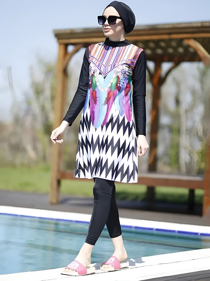 • تصميم محتشم مكون من ثلاث قطع : يسمح لك الجزء العلوي ذو الأكمام الطويلة والبنطلون والحجاب القابل للفصل بالسباحة بحرية مع الحفاظ على احتشامك. يضع التصميم الفريد معيارًا جديدًا في أزياء ملابس السباحة الإسلامية.