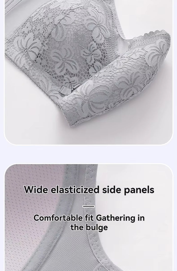 Gray lace underwear with text highlighting features on a white background