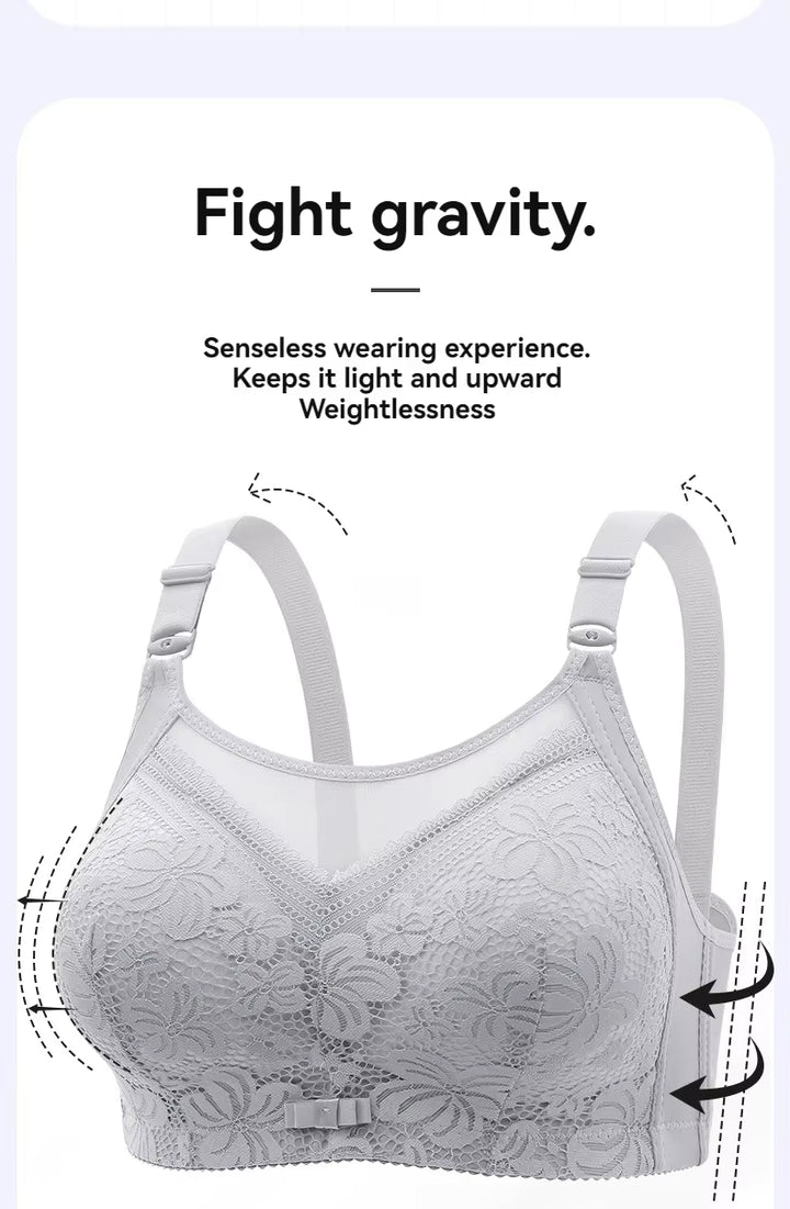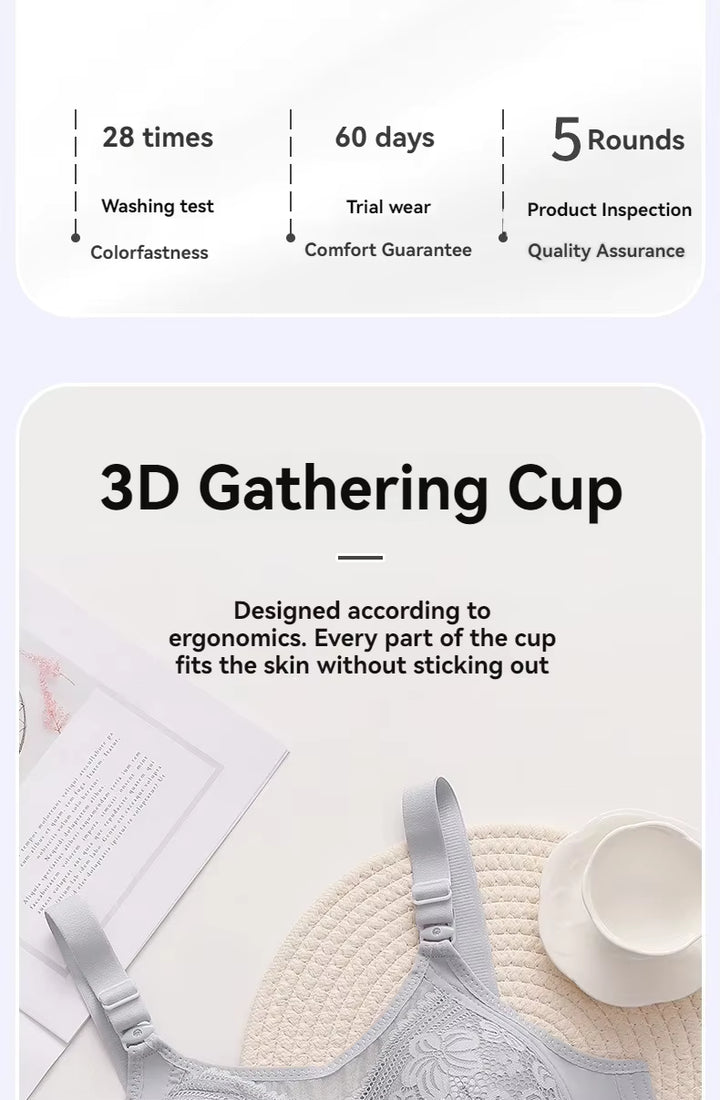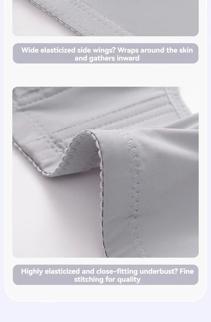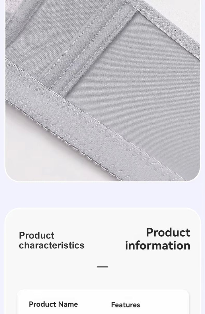 Gray ribbed fabric with text about no steel ring constraints and stable support.