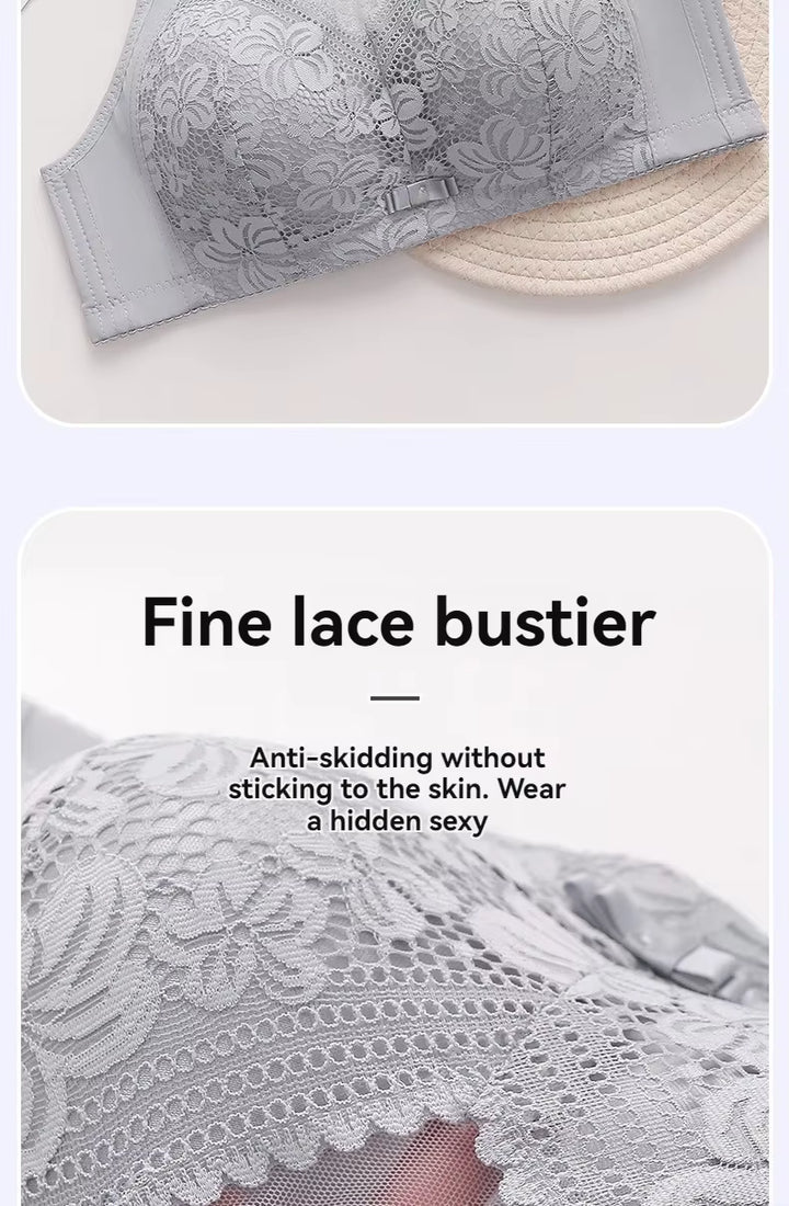 Gray lace bustier with text describing its features on a light background