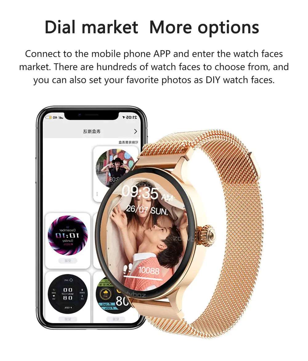 This Fashion Smart Watch is a multifunctional sports watch suitable for any active woman. The watch is designed to be stylish and is a round shape with a 1.3-inch screen. The screen resolution is 240*240, and it has multiple dials, including four default dials that can be customized according to personal preferences. The watch supports various languages, including English, Russian, Spanish, Polish, Portuguese, Italian, French, German, Korean, Japanese, and Arabic.